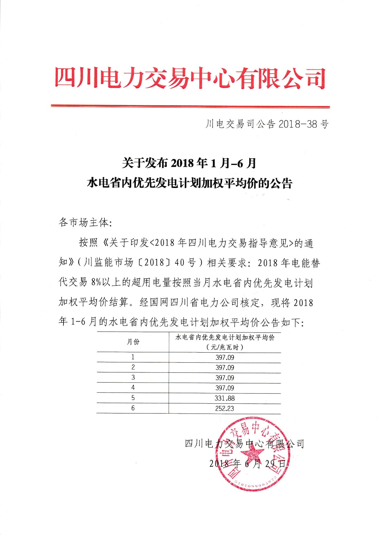 四川發(fā)布2018年1月-6月水電省內(nèi)優(yōu)先發(fā)電計劃加權(quán)平均價的公告