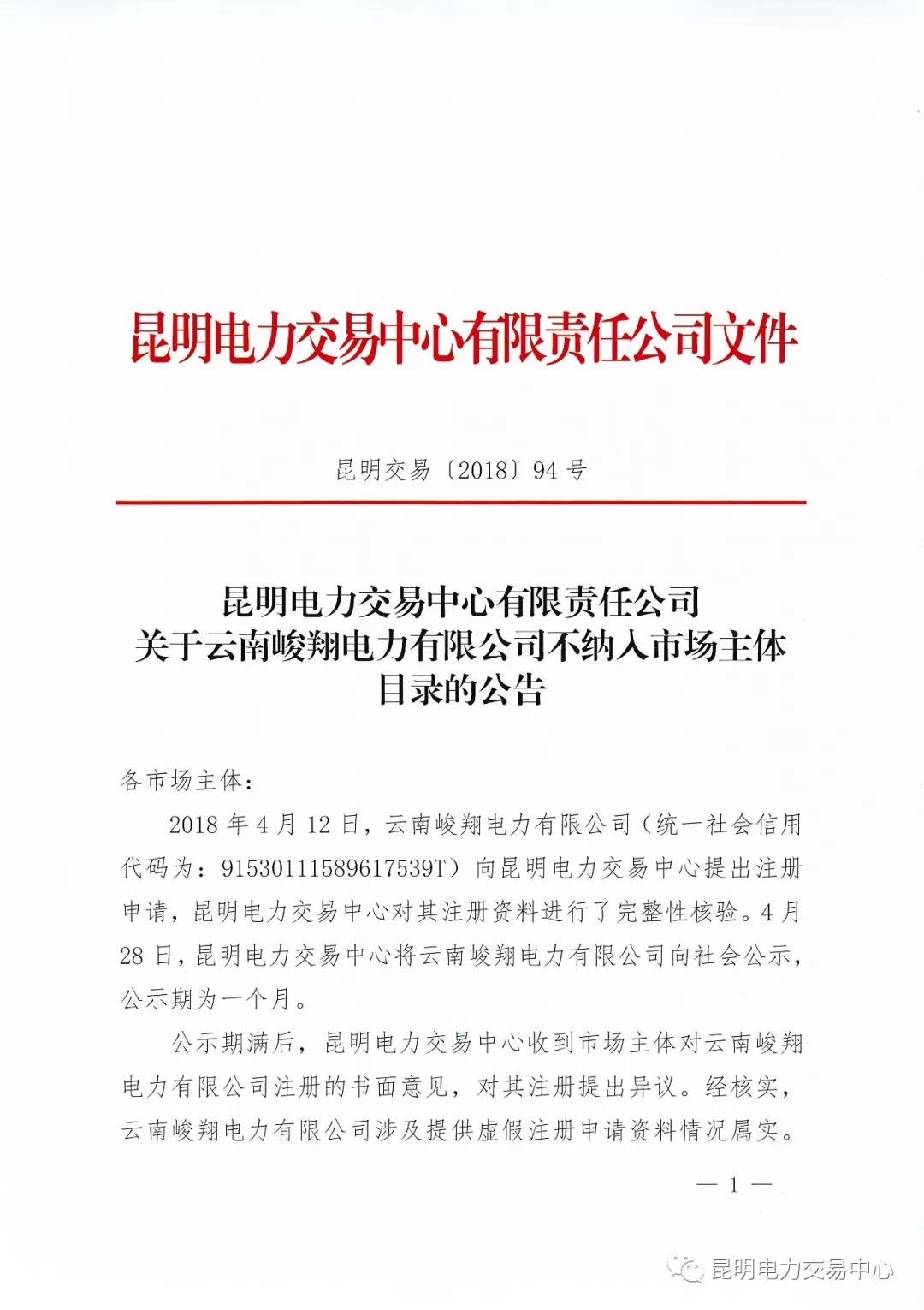 昆明電力交易中心有限責(zé)任公司關(guān)于云南峻翔電力有限公司不納入市場(chǎng)主體目錄的公告