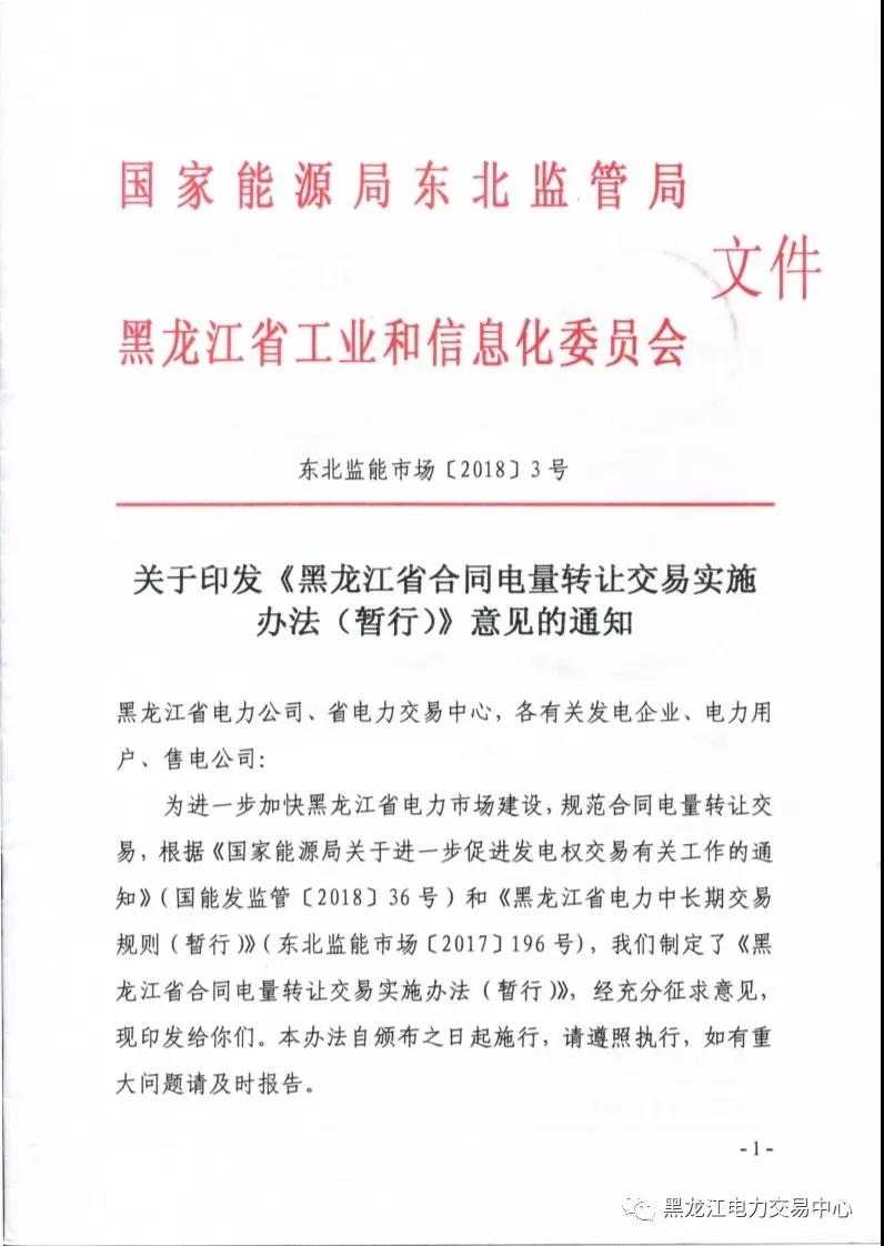 東北監(jiān)能市場(chǎng)〔2018〕3號(hào)關(guān)于印發(fā)《黑龍江省合同電量轉(zhuǎn)讓交易實(shí)施辦法(暫行)》意見的通知