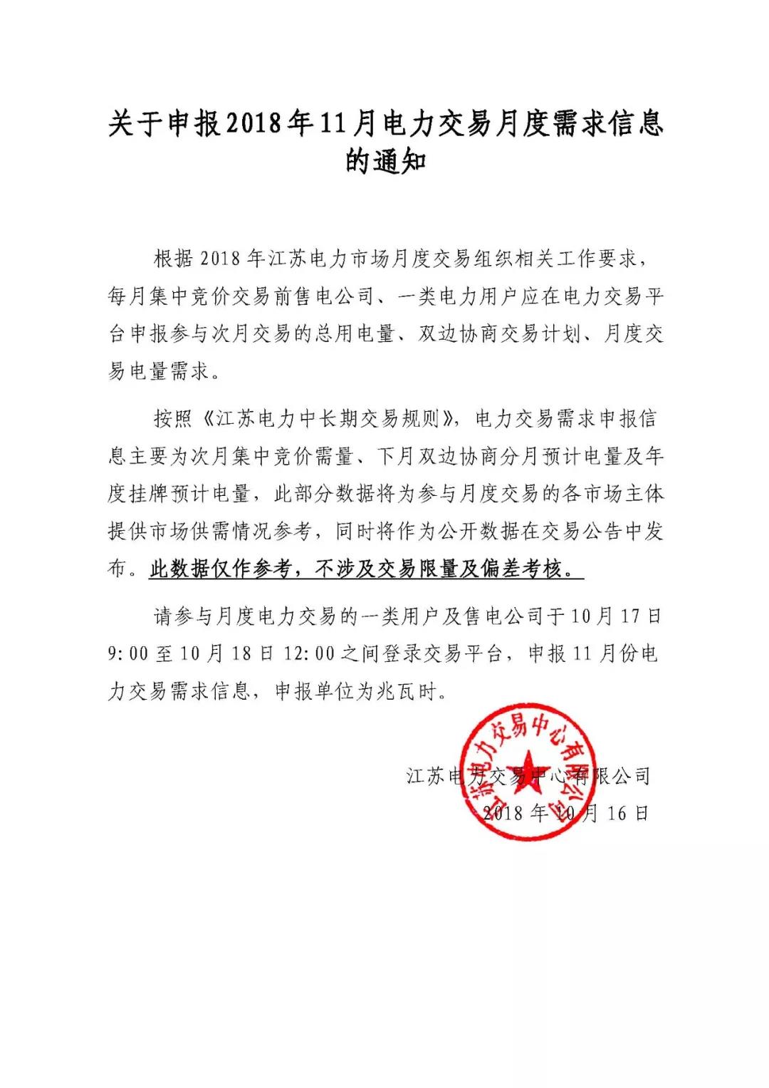 江蘇關(guān)于申報(bào)2018年11月電力交易月度需求信息的通知