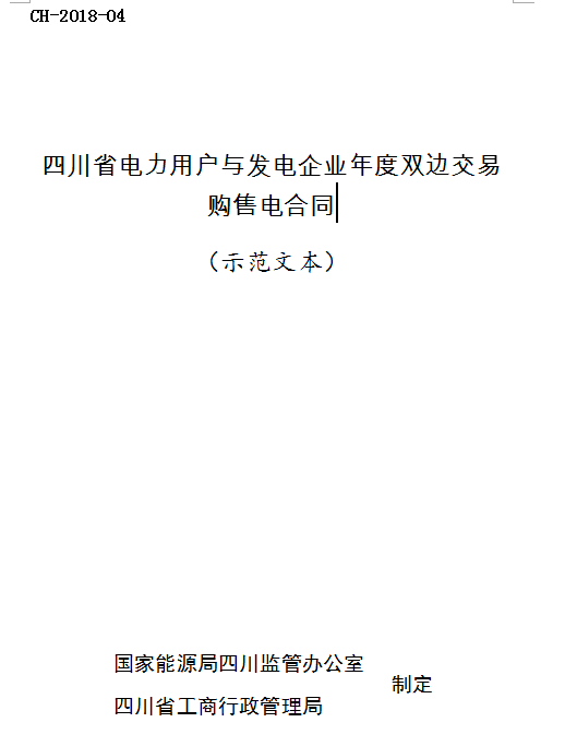 國(guó)家能源局四川監(jiān)管辦公室與四川省工商行政管理局,依據(jù)相關(guān)法律、法規(guī)、規(guī)章,共同制定了《四川省市場(chǎng)化零售供用電合同(示范文本)》《四川省售電公司與發(fā)電企業(yè)年度雙邊交易購(gòu)電合同(示范文本)》《四川省售電公司與電力用戶購(gòu)售電合同(示范文本)》和《四川省電力用戶與發(fā)電企業(yè)年度雙邊交易購(gòu)售電合同(示范文本)》。