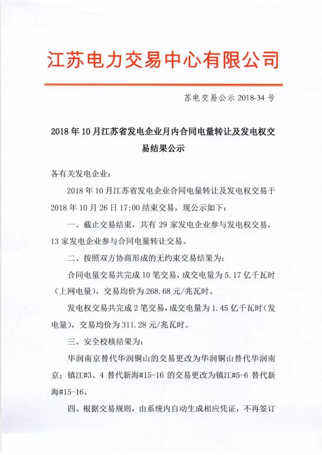2018年10月江蘇省發(fā)電企業(yè)月內(nèi)合同電量轉(zhuǎn)讓及發(fā)電權(quán)交易結(jié)果公示
