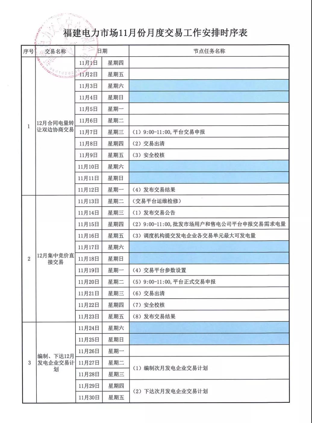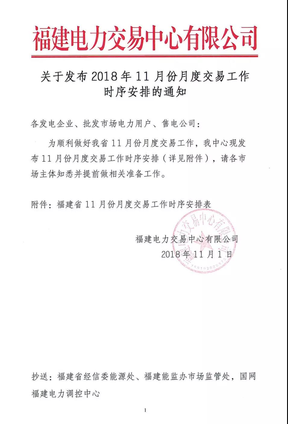 福建關(guān)于發(fā)布2018年11月份月度交易工作時(shí)序安排的通知