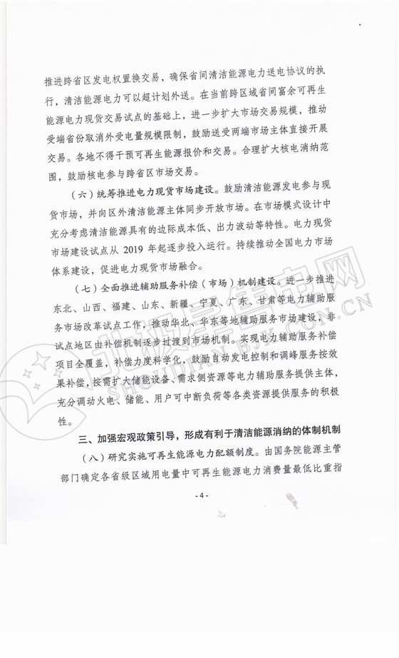 2.擴大清潔能源跨省區(qū)市場交易。打破省間電力交易壁壘,推進跨省區(qū)發(fā)電權(quán)置換交易,確保省間清潔能源電力送電協(xié)議的執(zhí)行,清潔能源電力可以超計劃外送。在當前跨區(qū)域省間富余可再生能源電力現(xiàn)貨交易試點的基礎(chǔ)上,進一步擴大市場交易規(guī)模,推動受端省份取消外受電量規(guī)模限制,鼓勵送受兩端市場主體直接開展交易。各地不得干預(yù)可再生能源報價和交易。合理擴大核電消納范圍,鼓勵核電參與跨省區(qū)市場交易。