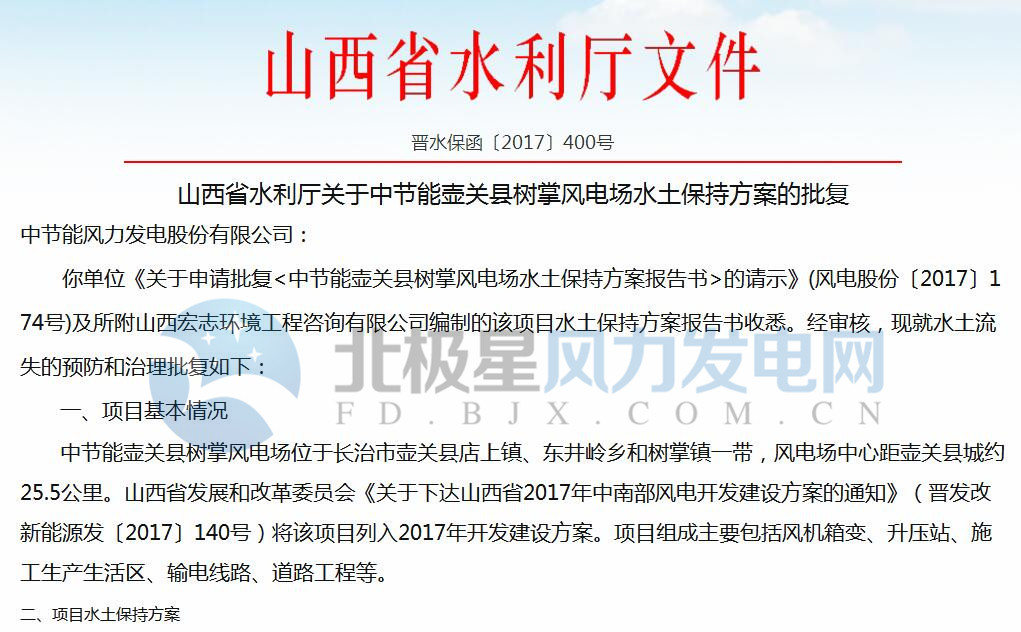 山西水利廳近日批復(fù)核準(zhǔn)中節(jié)能壺關(guān)縣樹掌風(fēng)電場水土保持方案。以下為源文件:山西省水利廳2017年6月2日