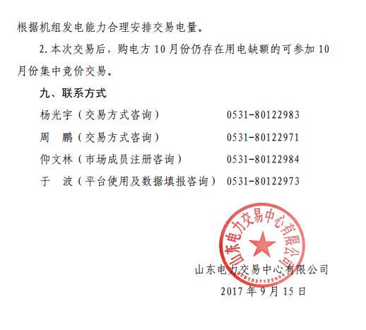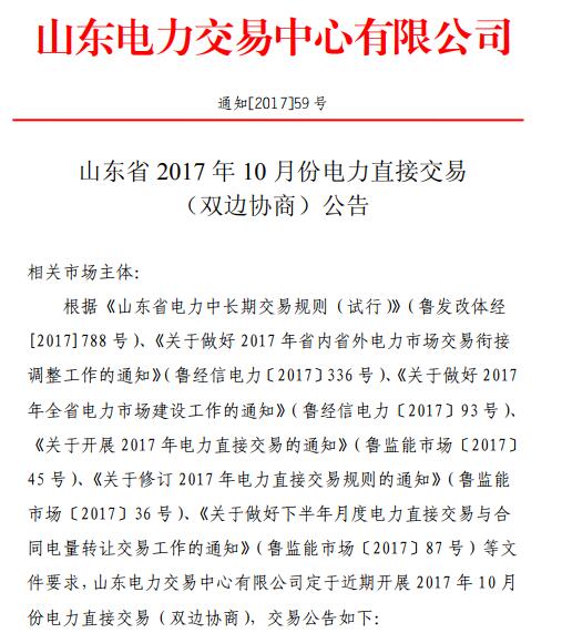 2017年9月15日,山東電力交易中心發(fā)布《山東省2017年10月份電力直接交易(雙邊協(xié)商)公告》。山東將于2017年9月18日14:00-17:00開展2017年10月份電力直接交易,交易結(jié)束后,購(gòu)電方10月份仍存在用電缺額的可參加10月份集中競(jìng)價(jià)交易。