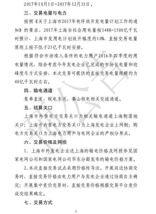 2017年9月19日,上海電力交易中心發(fā)布《2017年10-12月上海年度電力直接交易預公告》。《預公告》中發(fā)布的交易時間為:2017年10月1日-2017年12月31日,交易電量為40億千瓦時。分別為雙邊協(xié)商交易和集中競價交易兩