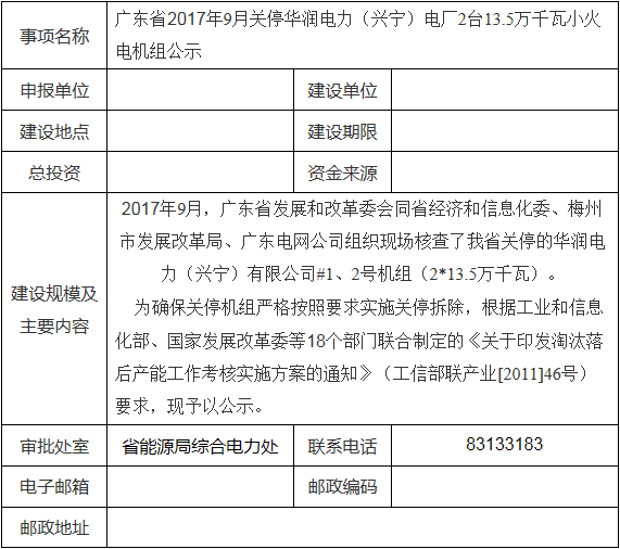 ,近日,廣東省發(fā)改委發(fā)布了2017年9月關停華潤電力(興寧)電廠2臺13.5萬千瓦小火電機組公示,詳情如下: