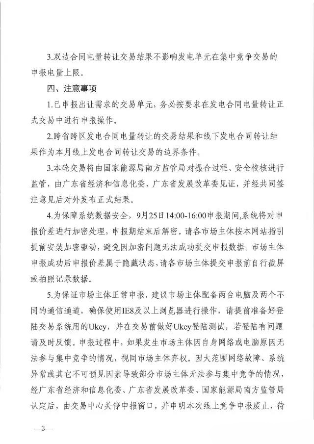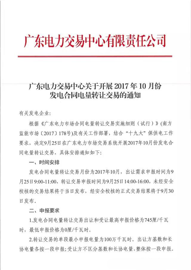 2017年9月22日,廣東電力交易中心發(fā)布《開展2017年10月份發(fā)電合同電量轉(zhuǎn)讓交易的通知》,將于9月25日14:00-16:00開展發(fā)電合同電量轉(zhuǎn)讓交易,月份為2017年10月。出讓需求申報時間為9月25日9:00-11:00,未經(jīng)安全校核的交易結(jié)果當(dāng)日發(fā)布,經(jīng)安全校核的正式交易結(jié)果于9月30日發(fā)布。