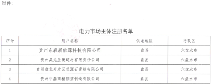 貴州省經(jīng)信委日前發(fā)布了《關(guān)于對列入政府準(zhǔn)入目錄的電力市場主體進(jìn)行公示的通知》,貴州東森新能源科技有限公司、貴州昊龍勝境建材有限責(zé)任公司、貴州盤北開發(fā)區(qū)雙源石膏粉有限公司、貴州中鼎高精銅箔制造有限公司符合年度電力市場化交易準(zhǔn)入條件,同意列入貴州電力市場主體準(zhǔn)入目錄。