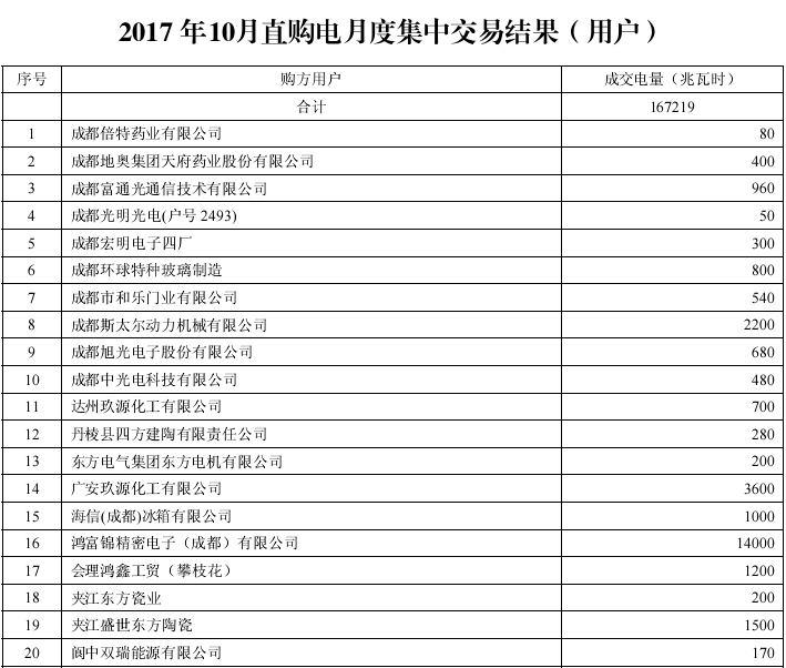 四川2017年10月份月度直購(gòu)電及富余電量交易結(jié)果已公布
