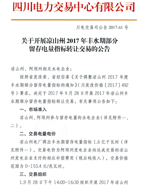四川開展涼山州2017年豐水期部分留存電量指標轉(zhuǎn)讓交易