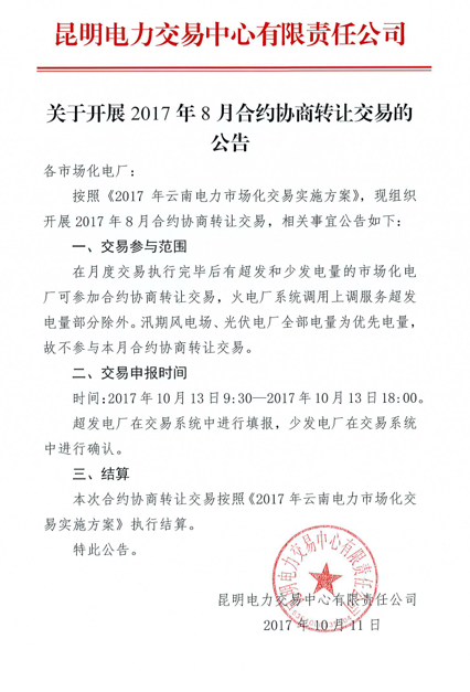 2017年10月11日,昆明電力交易中心發(fā)布公告,按照《2017年云南電力市場(chǎng)化交易實(shí)施方案》,將于2017年10月13日9:30-18:00開(kāi)展2017年8月合約協(xié)商轉(zhuǎn)讓交易。在月度交易執(zhí)行完畢后有超發(fā)和少發(fā)電量的市場(chǎng)化電廠可參加