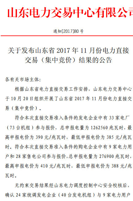 山東電力交易中心發(fā)布關于2017年11月份電力直接交易(集中競價)成交結果的公告,無約束交易結果經(jīng)山東電力調度控制中心安全校核后,確認24家統(tǒng)調發(fā)電企業(yè)(40臺發(fā)電機組)與9家電力用戶及28家售電公司達成交易電量