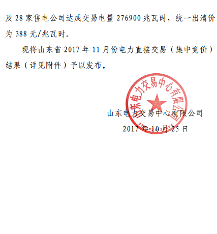 山東電力交易中心發(fā)布關于2017年11月份電力直接交易(集中競價)成交結果的公告,無約束交易結果經(jīng)山東電力調度控制中心安全校核后,確認24家統(tǒng)調發(fā)電企業(yè)(40臺發(fā)電機組)與9家電力用戶及28家售電公司達成交易電量276900兆瓦時,統(tǒng)一出清電價為388元/兆瓦時。.