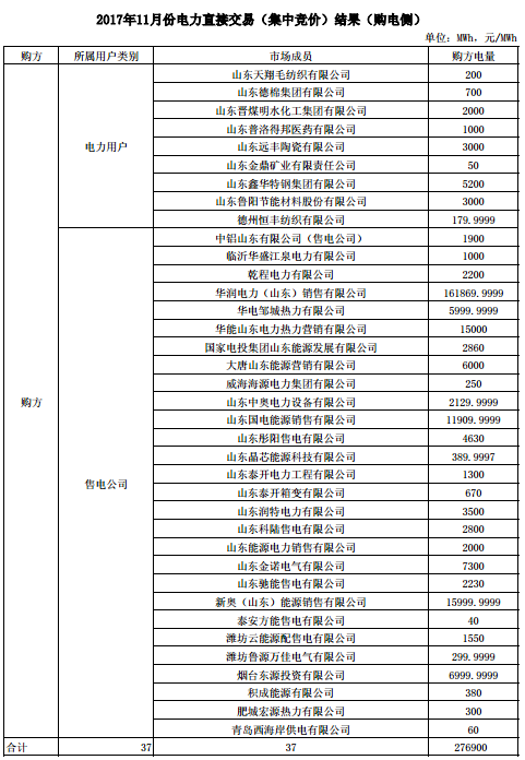 山東發(fā)布11月份電力直接交易(集中競價)結果:成交電量276900兆瓦時