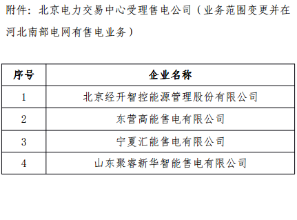 河北電力交易中心有限公司于2017年9月29日至2017年10月28日, 對(duì)北京電力交易中心受理并在河北南部電網(wǎng)有售電業(yè)務(wù)的北京經(jīng)開(kāi)智控能源管理股份有限公司等4家售電公司的注冊(cè)申請(qǐng)材料進(jìn)行了業(yè)務(wù)范圍變更公示。公示
