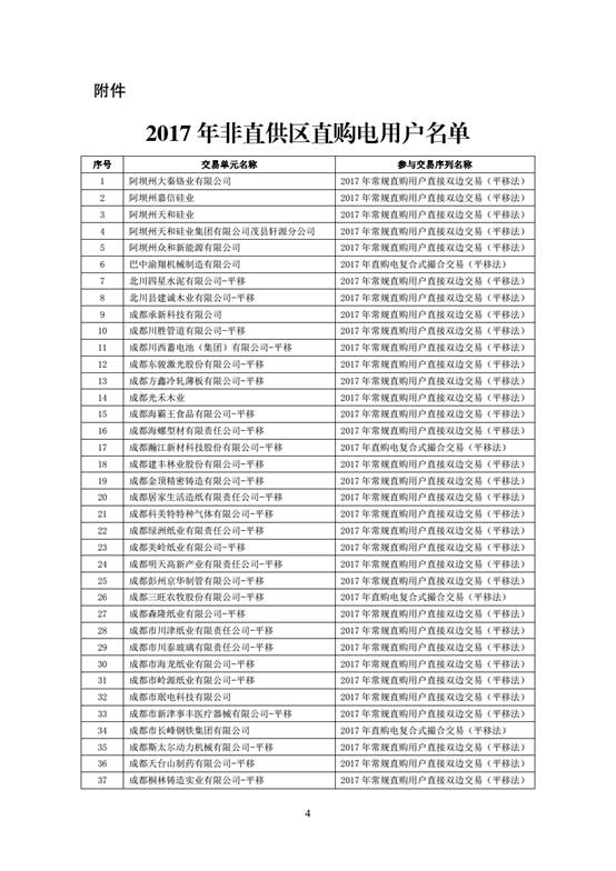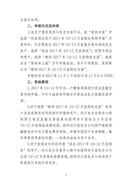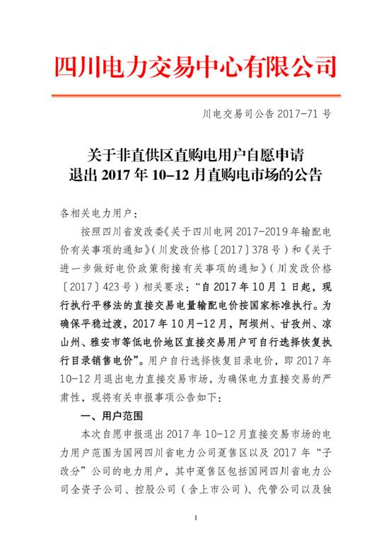 四川發(fā)布《關(guān)于非直供區(qū)直購(gòu)電用戶自愿申請(qǐng)退出2017年10至12月直購(gòu)電市場(chǎng)的公告》
