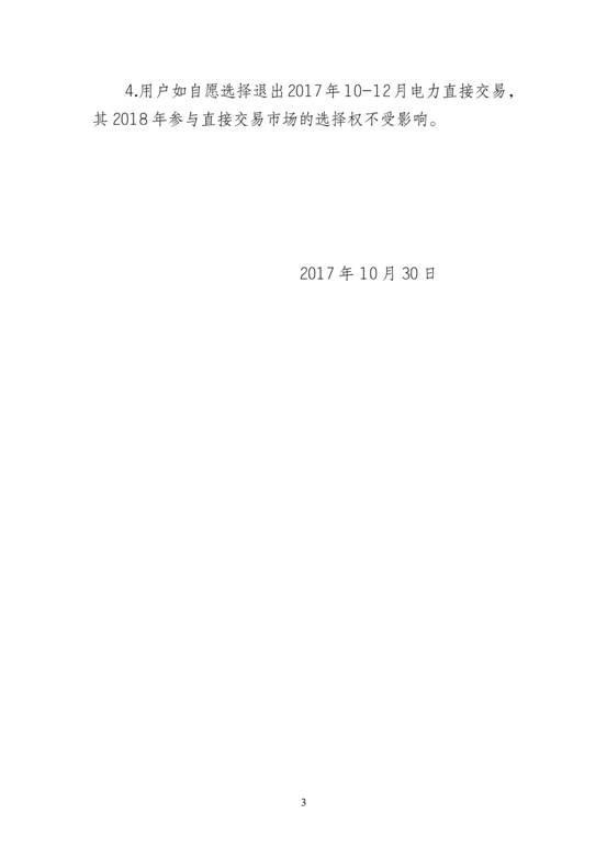 10月31日,四川發(fā)布《關(guān)于非直供區(qū)直購(gòu)電用戶自愿申請(qǐng)退出2017年10至12月直購(gòu)電市場(chǎng)的公告》,稱自2017年10月1日起,現(xiàn)行執(zhí)行平移法的直接交易電量輸配電價(jià)按國(guó)家標(biāo)準(zhǔn)執(zhí)行。為確保平穩(wěn)過渡,2017年10月至12月,阿