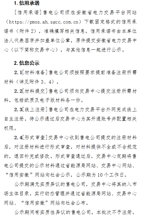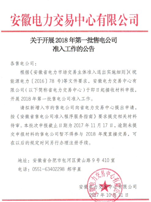 安徽電力交易中心10月31日發(fā)布了《關(guān)于開展2018年第一批售電公司準入工作的公告》,公告中稱,安徽電力交易中心將開始接收材料申報,開展2018年第一批售電公司準入工作。擬新增入市的售電公司向省電力交易中心提出申請,按《安徽省售電公司準入程序服務(wù)指南》要求提交相關(guān)材料待審。申報截止日期為11月17日,逾期未提交申報材料的售電公司暫不得參與2018年度直接交易。