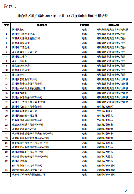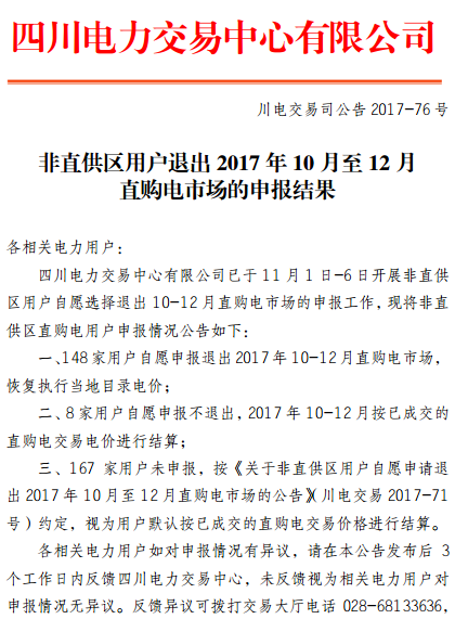 148家自愿退出!四川電力交易中心發(fā)布《關(guān)于非直供區(qū)用戶退出2017年10月至12月直購電市場申報結(jié)果的公告》
