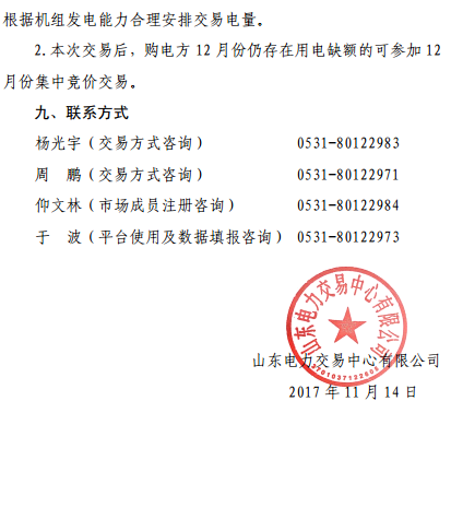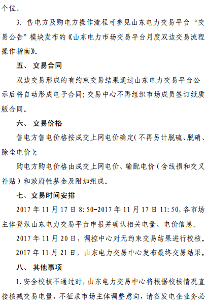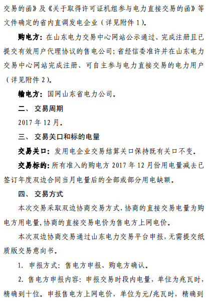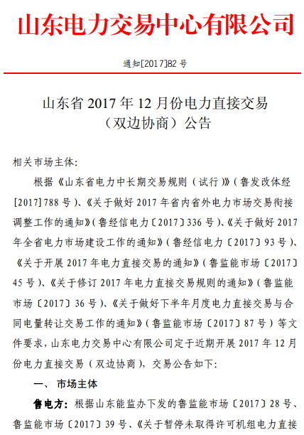 山東發(fā)布《山東省2017年12月份電力直接交易(雙邊協(xié)商)公告》