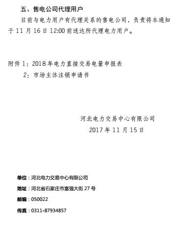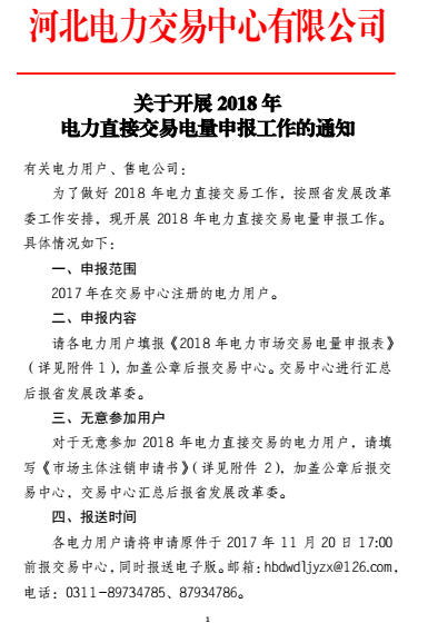 河北電力交易中心日前發(fā)布了《關于開展2018年電力直接交易電量申報工作的通知》,申報范圍為2017年在交易中心注冊的電力用戶,各電力用戶填報《2018年電力市場交易電量申報表》,對于無意參加2018年電力直接交易的電力用戶,須填寫市場主體注冊申請書,詳情如下: