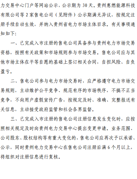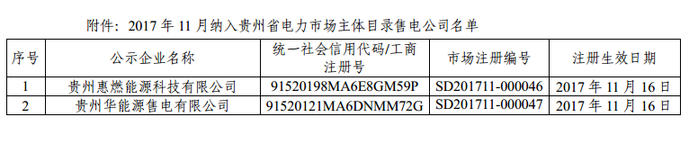 貴州惠燃能源科技有限公司等2家售電公司納入貴州省電力市場主體目錄