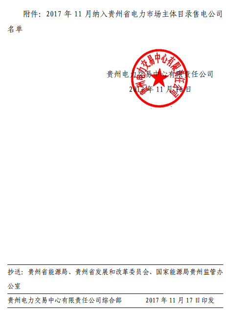 11月20日,貴州電力交易中心發(fā)布了《2017年11月納入貴州省電力市場主體目錄售電公司名單的通知》,通知稱貴州惠燃能源科技有限公司等2家售電公司(見附件)公示期滿無異議,按規(guī)定注冊手續(xù)自動生效,并納入貴州省電