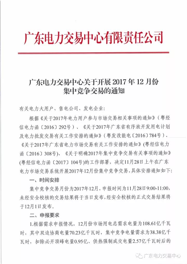 根據(jù)2017年12月份集中競(jìng)爭(zhēng)交易時(shí)間安排,廣東電力交易中心定于11月28日上午開展12月集中競(jìng)爭(zhēng)交易,具體事項(xiàng)安排如下: