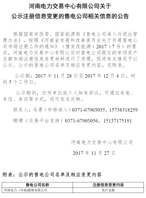 近日,河南電力交易中心發(fā)布了《關(guān)于公示注冊(cè)信息變更的售電公司相關(guān)信息的公告》,公告稱中心對(duì)華潤(rùn)電力(河南)銷售有限公司提交的單項(xiàng)資產(chǎn)總額市場(chǎng)注冊(cè)信息變更材料進(jìn)行了受理,公示期為2017年11月28日至12月4日。