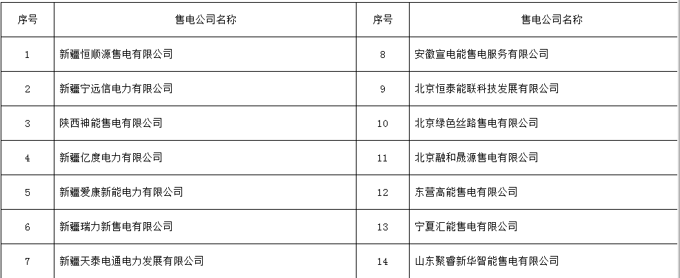 2017年11月,新疆電力交易中心受理14家售電公司,公示期為2017年11月01日至2017年11月30日,時(shí)間為1個(gè)月公示期滿,名單如下: