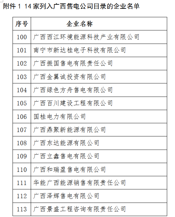 12月4日,廣西電力交易中心發(fā)布了《關(guān)于公布14家列入廣西售電公司目錄企業(yè)名單的通知》,通知稱經(jīng)企業(yè)自愿申報(bào)注冊(cè),廣西電力交易中心完成初步審核并向社會(huì)公示,廣西西江環(huán)境能源科技產(chǎn)業(yè)有限公司、南寧市新達(dá)桂