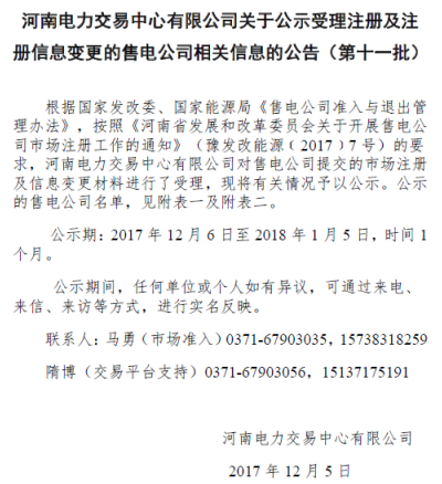 12月5日,河南電力交易中心發(fā)布了《關(guān)于公示受理注冊(cè)及注冊(cè)信息變更的售電公司相關(guān)信息的公告(第十一批)》,稱(chēng)中心對(duì)9家售電公司提交的市場(chǎng)注冊(cè)信息進(jìn)行了受理,此外,對(duì)洛陽(yáng)新奧能源發(fā)展公司的注冊(cè)信息進(jìn)行了變更。公示期:2017年12月6日至2018年1月5日,時(shí)間1個(gè)月。
