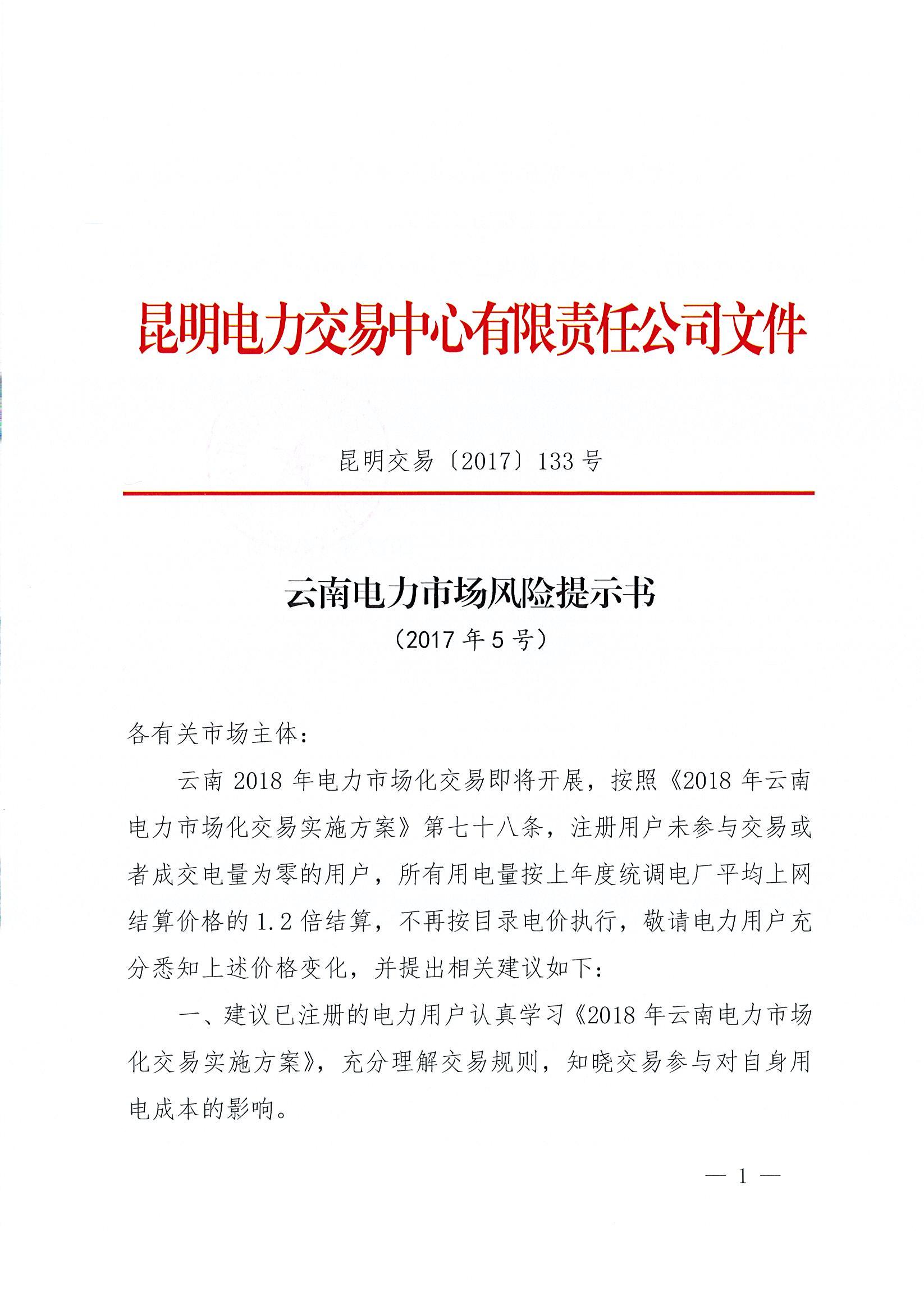 昆明電力交易中心日前發(fā)布了云南電力市場風(fēng)險提示書,其中提到云南2018年電力市場化交易即將開展,注冊用戶未參與交易或者成交電量為零的用戶,所有用電量按上年度統(tǒng)調(diào)電廠平均上網(wǎng)結(jié)算價格的1 2倍結(jié)逄,不再按目