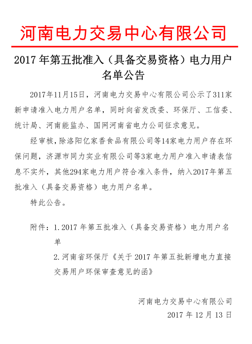 河南電力交易中心日前公布了2017年第五批準(zhǔn)入(具備交易資格)電力用戶名單,經(jīng)審核,除洛陽(yáng)億家香食品有限公司等14家電力用戶存在環(huán)保問(wèn)題,濟(jì)源市同力實(shí)業(yè)有限公司等3家電力用戶準(zhǔn)入申請(qǐng)表信息不實(shí)外,其他294
