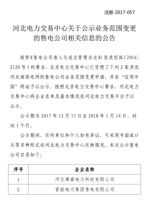 河北公示2家業(yè)務范圍變更的售電公司