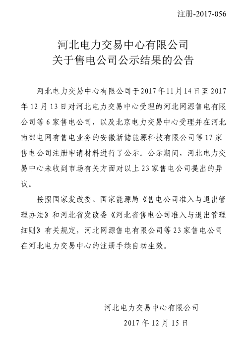 河北電力交易中心日前發(fā)布了關(guān)于售電公司公示結(jié)果的公告,公告中稱,河北電力交易中心于2017年11月14日至2017年12月13日對(duì)河北電力交易中心受理的河北網(wǎng)源售電有限公司等6家售電公司,以及北京電力交易中心受理并在河北南部電網(wǎng)有售電業(yè)務(wù)的安徽新儲(chǔ)能源科技有限公司等17家售電公司注冊(cè)申請(qǐng)材料進(jìn)行公示,未收到23家售電公司的異議,注冊(cè)手續(xù)自動(dòng)生效。詳情如下: