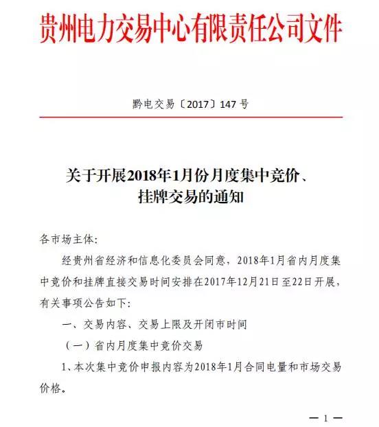 貴州2018年1月月度集中競(jìng)價(jià)、掛牌交易于21、22日展開