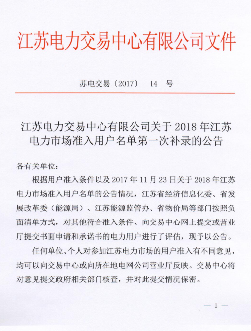 2018年江蘇電力市場(chǎng)準(zhǔn)入第一次補(bǔ)錄用戶名單的公告 共包含147家電力用戶
