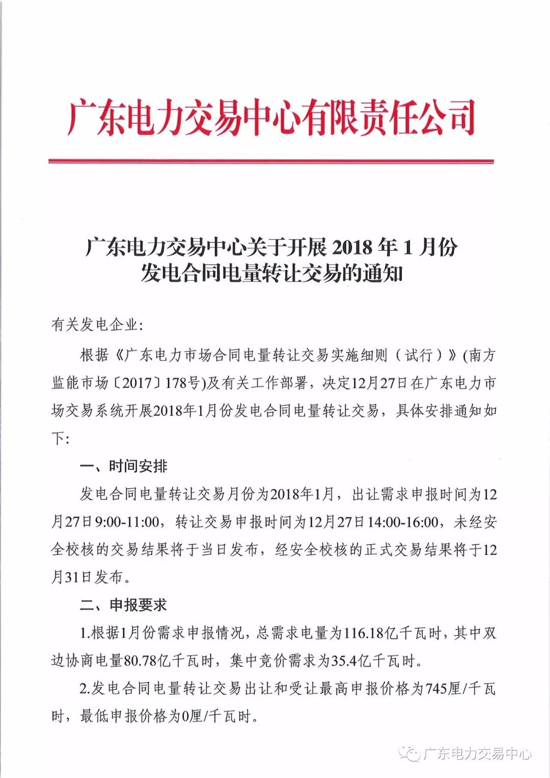 廣東電力交易中心日前發(fā)布了《關(guān)于開展2018年1月份發(fā)電合同電量轉(zhuǎn)讓交易的通知》,通知中稱,定于12月27日開展2018年1月份發(fā)電合同電量轉(zhuǎn)讓交易,出讓需求申報時間為12月27日9:00-11:00,轉(zhuǎn)讓交易申報時間為12