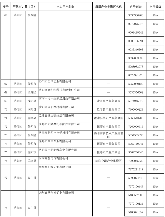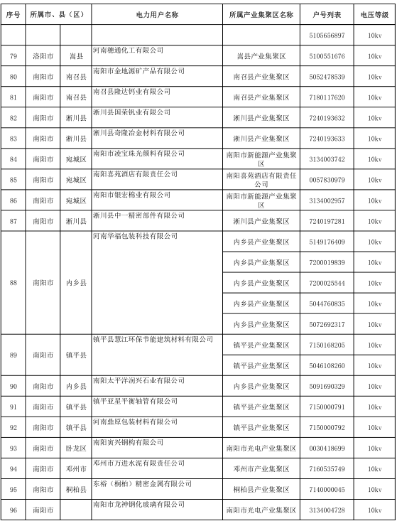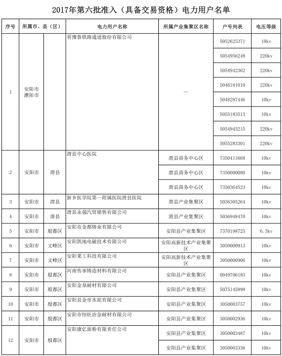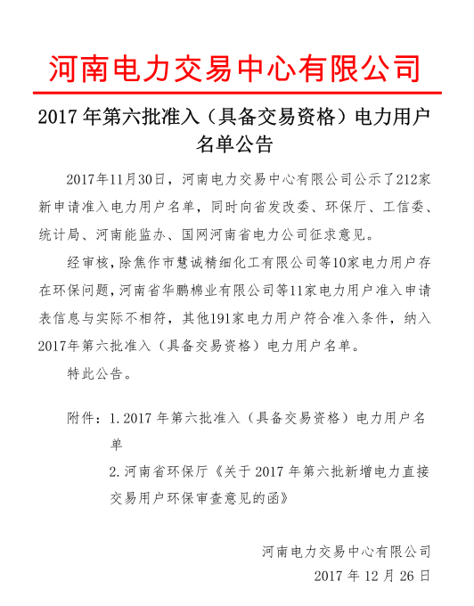 河南2017年第六批191家準入(具備交易資格)電力用戶名單