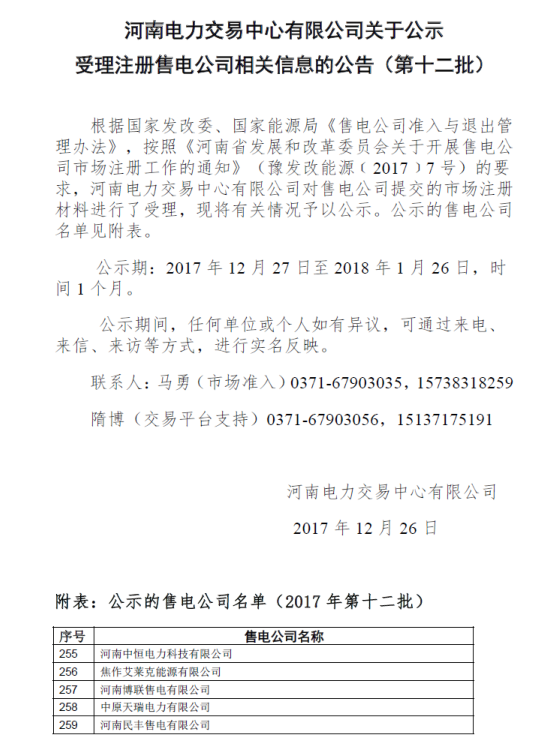 河南電力交易中心日前發(fā)布了關(guān)于公示受理注冊(cè)售電公司相關(guān)信息的公告(第十二批),名單中包含5家售電公司,公示期為2017年12月27日至2018年1月26日。
