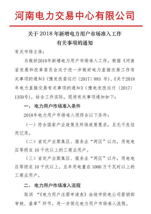 河南2018年新增電力用戶市場(chǎng)準(zhǔn)入工作有關(guān)事項(xiàng)發(fā)布