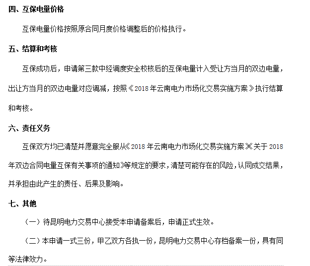 2018年1月3日,云南省昆明電力交易中心發(fā)布《關于2018年雙邊合同電量互保有關事項的通知》,電廠之間或用戶(售電公司)之間可對雙邊合同成交電量進行互保?;ケkp方須在上一月的月末簽訂次月的雙邊合同電量互保申請單,并提交昆明電力交易中心備案后生效(具體時間以信息披露為準),逾期不予受理。 原文如下: