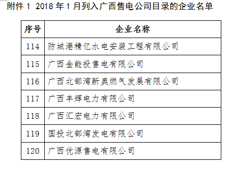 廣西公布2018年1月列入廣西售電公司目錄企業(yè)名單