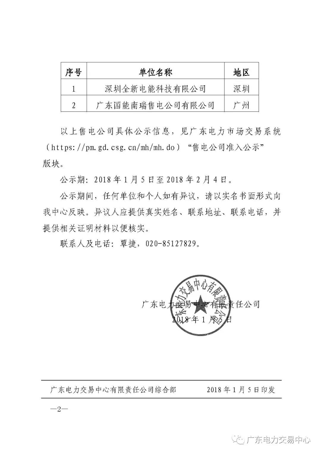 廣東電力交易中心日前發(fā)布了《關(guān)于公示2017年12月注冊售電公司的通知》,通知中稱,2017年12月廣東電力交易中心受理了2家售電公司的注冊申請,公示期為2018年1月5日至2018年2月4日。詳情如下:
