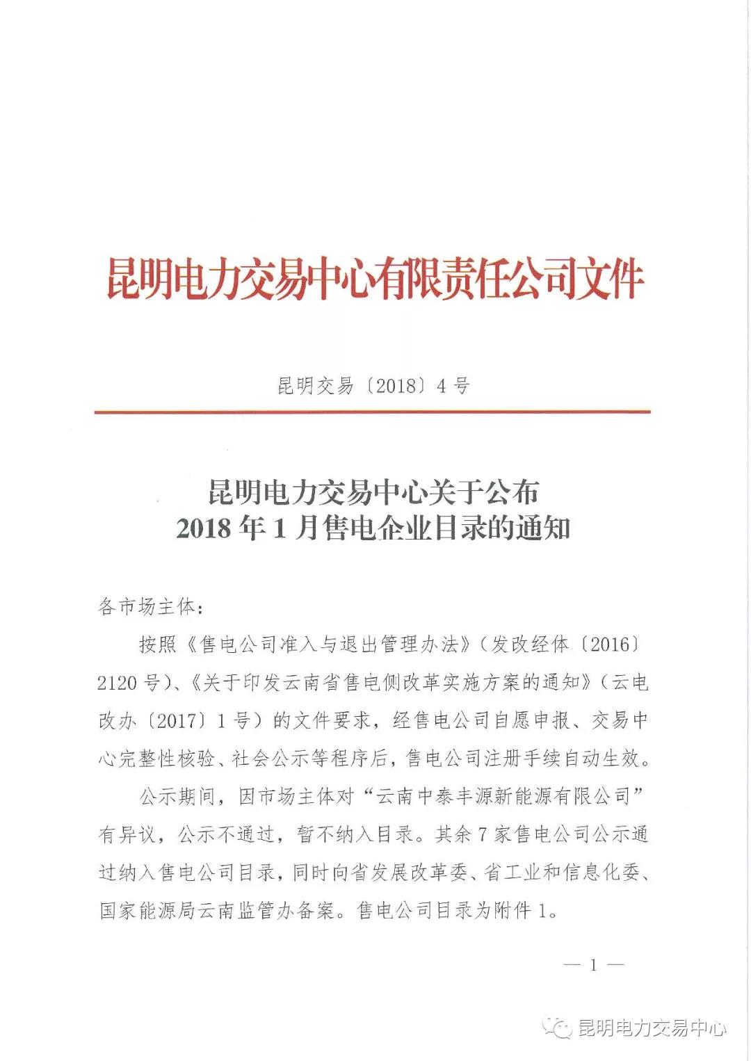 昆明電力交易中心日前公布了《2018年1月售電企業(yè)目錄》,公示期間,因市場主體對云南中泰豐源新能源有限公司有異議,公示不通過,暫不納入