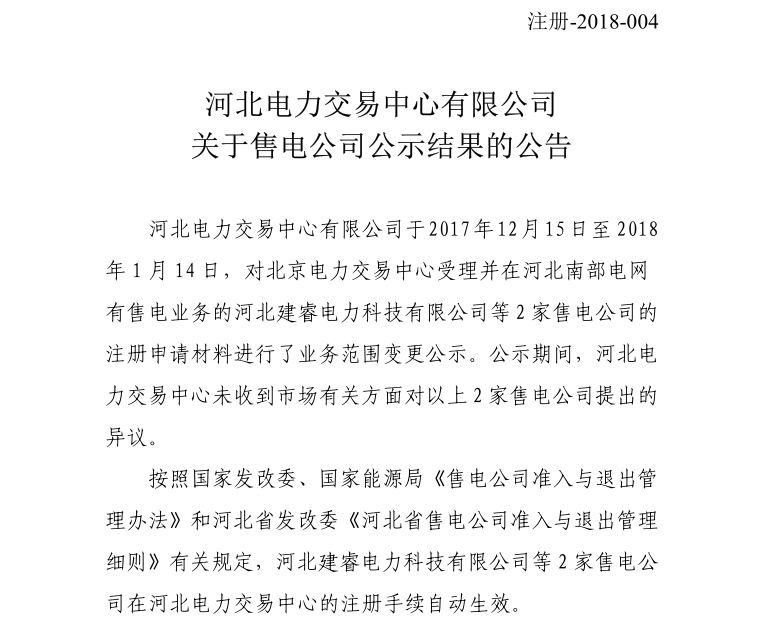 《河北電力交易中心有限公司關(guān)于售電公司公示結(jié)果的公告(注冊-2018-004)》