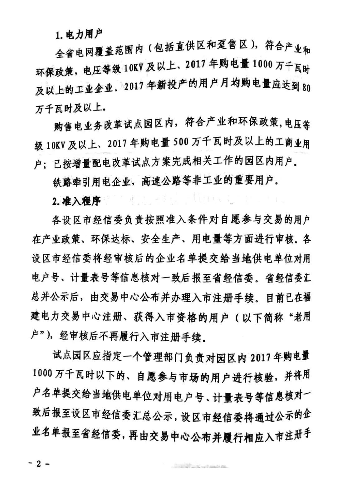 電力用戶:全省電網(wǎng)覆蓋范圍內(nèi)(包括直供區(qū)和躉售區(qū)),符合產(chǎn)業(yè)和環(huán)保政策,電壓等級(jí)10KV及以上、2017年購電量1000萬千瓦時(shí)及以上的工業(yè)企業(yè),2017年新投產(chǎn)的用戶月均購電量應(yīng)達(dá)到80萬千瓦時(shí)及以上。